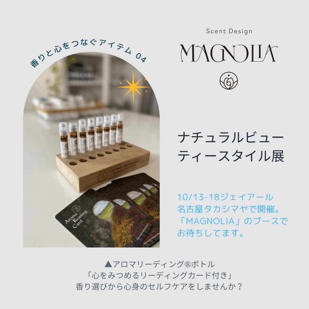 ナチュラルコスメの老舗催事。師匠吉川千明さん最後のプロデュース回ということで、数年ぶりに参加。 MAGNOLIAの香りアイテム、アロマリーディング体験のほか、美容家・吉川千明さんとトークショー「アロマリーディングで人生を読み解く」を実施。その時々... -